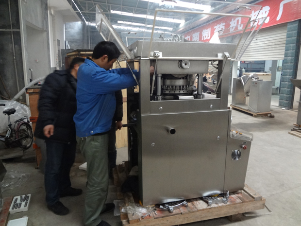 2011年12月,湖南化工職業(yè)技術(shù)學(xué)院向我廠購(gòu)買了ZP-35D高速全封閉變頻壓片機(jī),圖為現(xiàn)場(chǎng)調(diào)試驗(yàn)收實(shí)況。