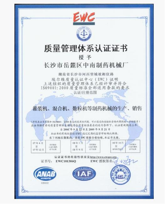 經(jīng)過(guò)3年的努力,我廠認(rèn)真按國(guó)際6S規(guī)范辦事,終結(jié)碩果。2006年9月,EWC國(guó)際認(rèn)證中心對(duì)我廠全方位嚴(yán)格評(píng)審,一舉通過(guò)ISO9001:2000質(zhì)量標(biāo)準(zhǔn)全部適用條款。該證書的取得,標(biāo)志著我廠全面質(zhì)量管理從此躍上了一個(gè)嶄新的臺(tái)階,也為我廠產(chǎn)品走向世界鋪出了一條綠色通道。