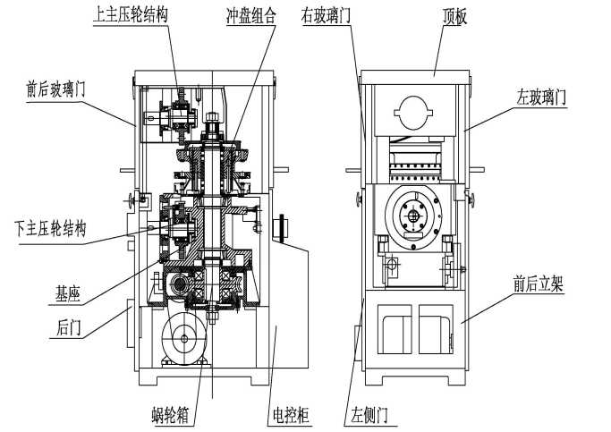 4 片厚(壓力)調(diào)節(jié)裝置:通過(guò)調(diào)節(jié)下壓輪上下,來(lái)調(diào)節(jié)片厚(壓力)。下壓輪裝在主體的槽內(nèi),它套在偏心軸上,外端連接在手輪上,當(dāng)外部手輪調(diào)節(jié)時(shí),偏心軸帶動(dòng)壓輪上升和下降,即調(diào)節(jié)片厚(壓力),借以控制片劑的厚度和硬度,上壓輪上下調(diào)節(jié)也可作為調(diào)節(jié)裝置,但在一般情況下不調(diào)。