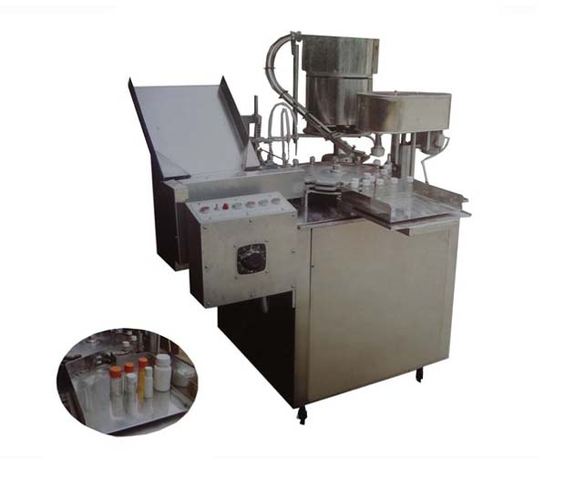 本機具有自動送瓶、自動灌裝、自動上蓋、旋(軋)蓋功能。采用活塞玻璃泵計量灌裝,具有無瓶不灌控制機構(gòu)。