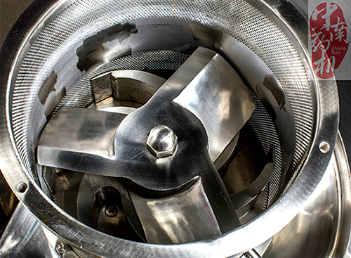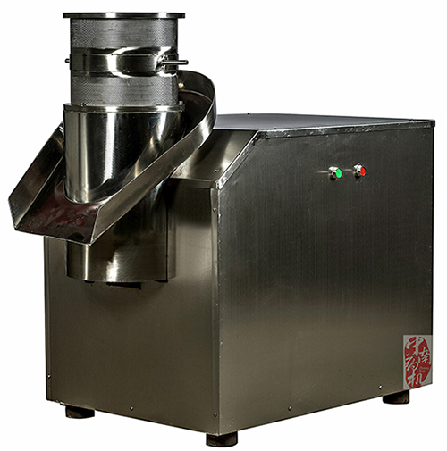 本機采用行星減速機構(gòu),通過電機變頻,實現(xiàn)無級變速,各種物料均能適應(yīng)。篩筒和制粒刀各自旋轉(zhuǎn)并相對運動。通過篩筒與制粒刀的旋搓作用,將物料擠出篩筒網(wǎng)孔。成圓柱條狀物料,經(jīng)篩筒外的切割切割下,成為大小均勻,長度一致的顆粒,(顆粒的大小由篩筒網(wǎng)孔直徑大小決定,長度由切割刀的把數(shù)決定)而且所制的顆粒不易松散.